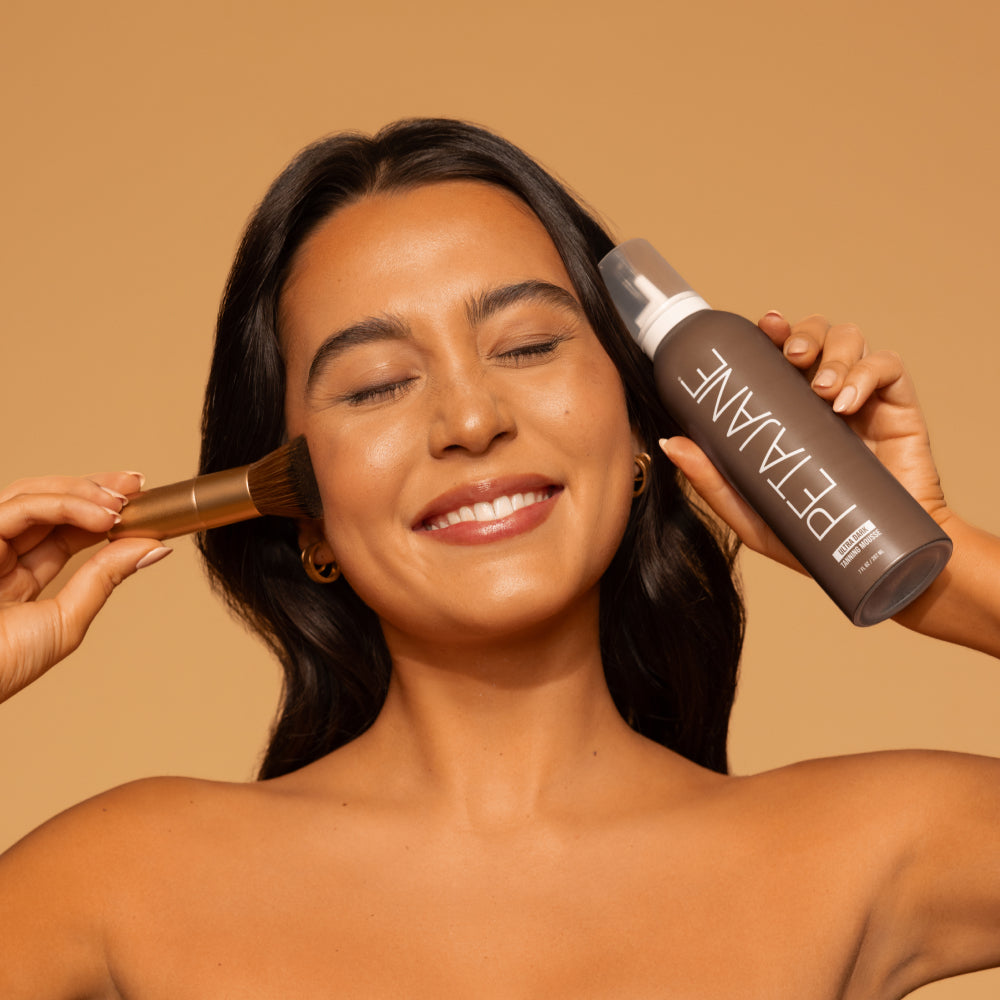• Face & Body Perfecting Brushes: After applying self-tanner to a small section of your body, immediately use the body perfecting brush to blend and smooth the product. Work in gentle, upward strokes in a circular motion. Start from the area where you applied the self-tanner and move outward to prevent streaks. Repeat: Continue applying self-tanner to small sections of your body and using the body brush to blend it in. Be diligent and thorough in your application, paying extra attention to areas prone to streaks like knees, elbows, ankles, and wrists. Check for Evenness: Periodically check your skin to ensure that the self-tanner is being evenly distributed and blended in. Adjust your brush strokes as needed to achieve a seamless finish. Face and Hands: The body brush may be too large and less precise for these areas. We recommend opting for our Face Perfecting Brush: Less is more: Apply a small amount of your chosen face tanning product to the brush or directly onto your face. Use light pressure: Using gentle, even strokes, blend the self-tanner evenly across your face. Start from the center and work outward for a natural look. Blend: Pay extra attention to blending around the hairline, jawline, and neck to avoid any harsh lines or streaks.