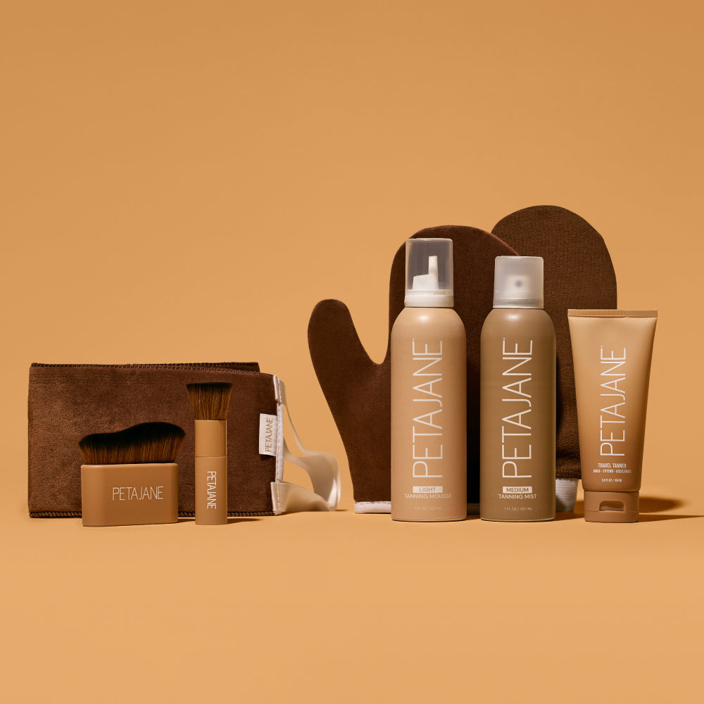 Self-Tanning Mousse: Shower before application. Exfoliate at least 24 hours prior to application. Avoid moisturizer or lotion at least 24 hours before applying. Shake well and pump the Tanning Mousse onto the PJB Mitt. Apply evenly in upward circular motions, starting with legs and working your way up. Work in small sections, as the tan dries quickly. With the leftover mousse on the mitt, cover hard to perfect areas such as hands and feet last. Your tan will develop in 6-8 hours. Shower in the morning, pat dry, and show off your tan.