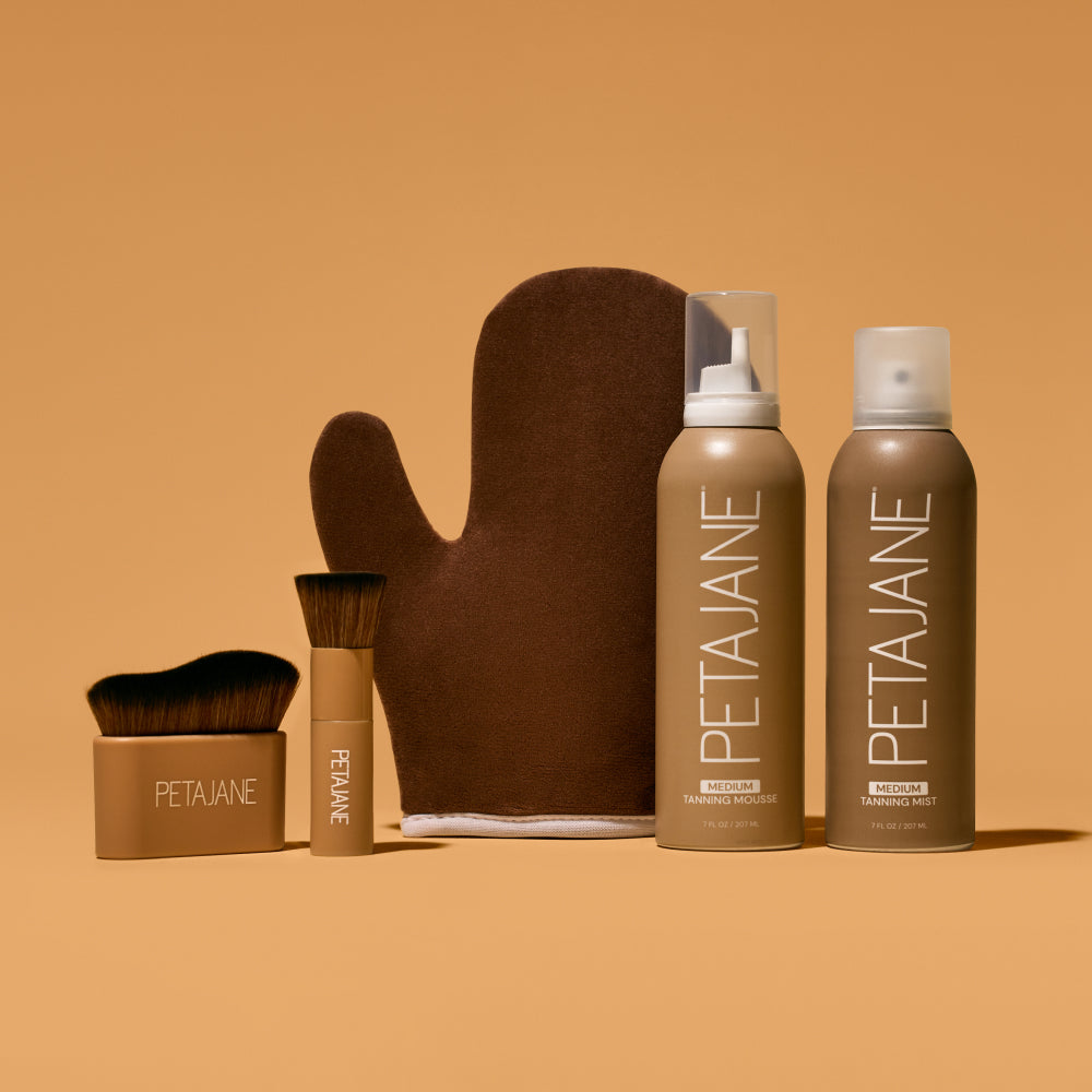 Self-Tanning Mousse: Shower before application. Exfoliate at least 24 hours prior to application. Avoid moisturizer or lotion at least 24 hours before applying. Shake well and pump the Tanning Mousse onto the PJB Mitt. Apply evenly in upward circular motions, starting with legs and working your way up. Work in small sections, as the tan dries quickly. With the leftover mousse on the mitt, cover hard to perfect areas such as hands and feet last. Your tan will develop in 6-8 hours. Shower in the morning, pat dry, and show off your tan.